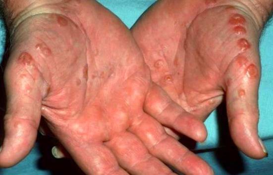 پوست خشک، ضخیم، ترک خورده و یا پوسته پوسته میشود. ملتهب و قرمز است. زخم میشود.